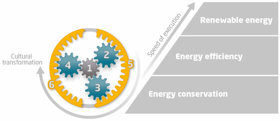 A symbolic model showing how energy management has been built up at Volvo CE. The elements are ranked by degree of importance. Central to the organization is to (1) appoint energy managers having both the skills and networks relevant to the position, (2) establish long-term commitment, vision, and follow-up, (3) utilize a systematic approach, (4) develop continuous improvement, (5) establish multiple sources of credibility, and (6) develop relevant KPIs and targets. This enhances cultural transformation and is kept in motion by active management at all levels in the corporation with a speed of execution.