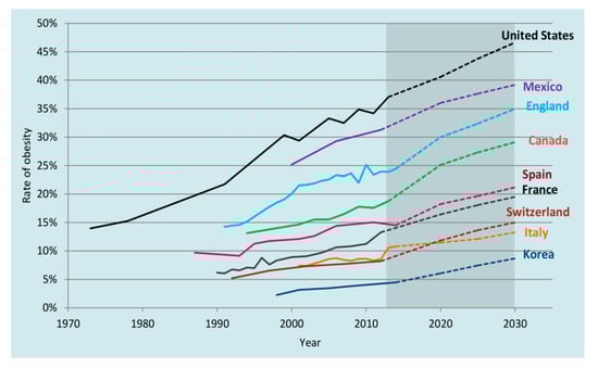 Projected rates of obesity. The Organisation for Economic Co-operation and Development (OECD) projections show a steady increase in obesity rates, until at least 2030. Obesity levels are expected to be particularly high in the United States, Mexico, and England. On the contrary, the increase is expected to be weaker in Italy and Korea, with obesity rates projected to be 13% and 9% in 2030, respectively. Obesity rates are projected to increase at a faster pace in Korea and Switzerland, where rates have been historically low. Obesity is defined by Body Mass Index (BMI) ≥30 kg/m. OECD projections assume that BMI will continue to rise as a linear function of time. Source: OECD analysis of national health survey data. www.oecd.org/health/obesity-update.htm © OECD 2017 [].