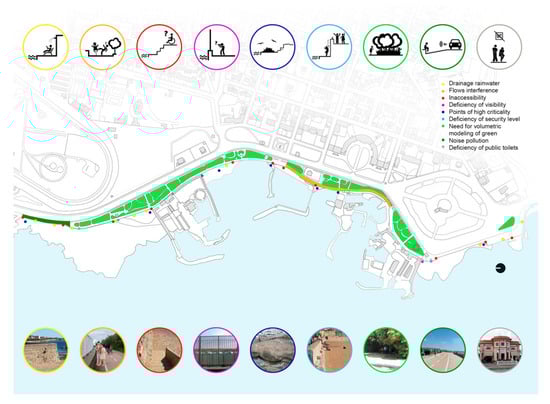 The results of the research showed that a possible design strategy for the case study should restore harmony to such a disordered and incoherent set of elements. It would be necessary to confer attractiveness to a site with an enormous potential, through the inclusion of commercial activities and entertainment, for the various phases of the day, and at the same time the problem of accessibility, and more generally of the usability of the area, with pedestrian and cycle paths, and with the adaptation of descents to the sea, so as to re-establish the direct relationship between the city and sea, which is sometimes compromised. The planned interventions, which were developed along the entire length of the coastal strip under study, were those concerning usability, with the reorganization of the cycle path, to minimize crossings and the pedestrian crossing paths. The latter should be re-evaluated in terms of the safety of the treading surfaces, which often resulted in disjointed or disconnected, and was enriched with information totems, to make the relationship with the functionalities of the sea-side, clear and perceptible. A concrete solution to the problem of accessibility to the sea, identifiable in the descents to the sea—the difficulty of use for motor-impaired passengers—could be to think of new systems of ramps and stairs. These should also removable, to be connected to new docks that allow easy access to the water-level. This aspect, as well as acting on accessibility, would also improve the attractiveness of places, extending the access to bathing to other groups of users.
