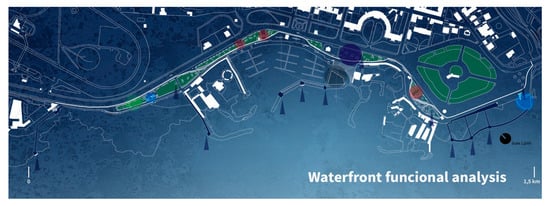 The concept of urban usability is conceived, today, as the field of forces on which the spatio-temporal relations and the structure of the city can be regulated, allowing and encouraging both free movement and full access for, both, physical and psychological well-being. Usability must be understood as an immediate and total usability of the built space, giving back to the user, the management of their time [,]. The European Union is also committed to making Europe’s cities healthy, attractive, and sustainable, and to improving the citizens’ quality of life, now and for the future, by defining the main indicators for making its cities, attractive and sustainable—clean and healthy, green and pleasant, efficient and sustainable, and well-managed and democratic []. On this double criterion usability/attractiveness, it would be possible to make the waterfront of Livorno a plural identity, so that it is no longer a line, but is instead a network of places, functions, grafts, and reconnections between the coast and the city, between port activities and urban activities, also with cultural and recreational functions that are added to those already present.