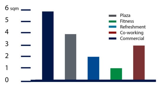 In the third phase, the design reflection was analyzed to find a match for the principles of a healthy city design. Initially a functional analysis was carried out (Figure 3). The project actually contains areas of different functions to make it usable for different types of users, in particular the commercial area is privileged, as a source of income, and this has enabled the creation of free services for the community, such as co-working and fitness areas. The existing restaurant areas are well-maintained, as they are a reference point for the community, while those in the project have different characteristics.