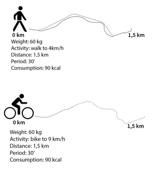 The presence of greenery and environmental sustainability are two concepts that are now assuming an increasingly important role in architectural and urban planning. Suffice to say, green is no longer found only on the ground, but has even reached the envelope of buildings, coverings, and facades [,]; sustainability is found in the method of building, in the use of specific materials and in the exploitation of renewable energy []. In this framework it will be necessary to find a corresponding project that elaborates the above-mentioned principles of a healthy city design. This can be achieved through a comparison of, the relationship between the built-up and green areas in the project, the integration of the planned and existing new functions, the accessibility of the routes in project, the pedestrian and cycle paths, and their ability to stimulate active lifestyles, through the verification of parameters that take into account the relationship between the path and the calorie consumption of individuals on the basis of the distance traveled and the speed of travel.