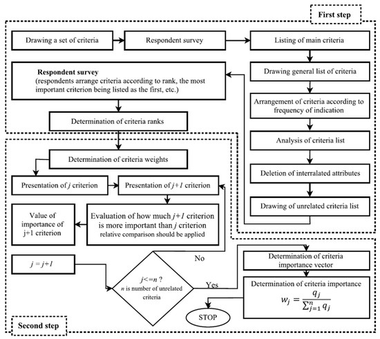 Criteria weight determining is a significant part of an MCDM problem with multi-dimensional criteria. It allocates a load for each dimension to make criteria comparison easier. Different criteria weight estimation methods can be used [46]. Some examples include Analytic Hierarchy Process (AHP) [47], Analytic Network Process (ANP) [48], Entropy [49], SWARA [50,51], and others. In this research, the SWARA method was applied. The approach is uncomplicated, has clear and understandable logic, and is simple to use. The SWARA method consists of the two main steps. At the first round, a group of experts acts together. The team, based on the own knowledge, ordered criteria from the most significant (given rank 1), to the least significant, the last position. At the second step, each expert acts separately. Then, a systematic comparison between each more significant criterion is made with the less significant one. Each expert makes the contrasts in the second step based on his judgement. Figure 1 shows the weight calculation procedure for the SWARA method. As the criteria weights in this MCDM problem represent the significance of each criterion, the authors asked five authorities of the constructor company to form the expert team for the SWARA method. Table 2 shows the criteria weights obtained from the SWARA method in grey numbers. Lower and upper limits of each grey number are the lowest and highest amount received from the SWARA method among for each criterion, respectively.