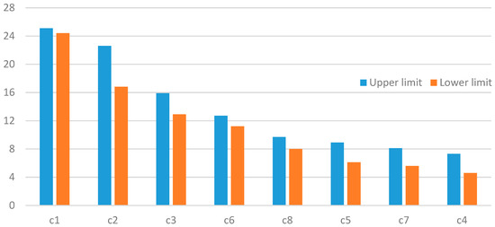 Among the eight criteria defined for this problem cost, duration and uncertainty about final consequences are the most effective ones. Table 2 shows that their cumulative weight is more than the five other criteria. In cases like ours, it is recommended to apply expert judgement to determine the values. The same as most cases in civil engineering, these values would not be precise enough with crisp numbers. Therefore, we calculated them in the shape of intervals. According to Table 2 and Figure 2, the range for some of the criteria weights like c1, c6, and c8 are more close to a crisp number. It means that experts’ judgements about the effect of these criteria are similar. Moreover, Equation (8) can be derived. The priority order for the five most essential criteria may also be valid for crisp values.