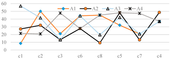 The authors asked the constructor to calculate the criteria values because constructor authorities are the most familiar persons with the project. Table 3 shows their completed GDMM and the requirements weight as the first row of the table. Table 3 is the main entry for different methods in the following sections. The expert team which consisted of the project manager, site manager, and constructor authorities prepared the table. The direct cost of each solution calculated without uncertainty and the uncertainty related to C1 is a part of the C3 values. However, the expert team believed that crisp values for other criteria would not demonstrate a project’s real situation. Therefore, each member of the expert team completed the table based on his judgment and the maximum and minimum value of the team members for each criterion value is as the upper and the lower limit of a grey number. Each member of the expert team was asked to score the criteria C3, C4, C5, C6, C7, and C8, based on his judgement with a value among 1 (very low), 2 (small), 3 (medium), 4 (high), and 5 (very high). The upper and lower limit of a grey number for some of the C2 values in Table 3 is close to each other. That means that these grey numbers are almost crisp. Figure 3 shows that no one of the alternatives is optimal according to all performance criteria.