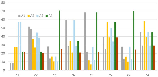 A3 alternative is considered to be the best for TOPSIS-GM and ARAS-G methods. According to the Geomean method, it ranks second, and the difference from the best alternative is only 8%. It is, therefore, the most appropriate choice. The Geomean method considers A4 as the best, while according to the ARAS-G method, it ranks second, and the difference from the best is 14%, and according to TOPSIS-GM it ranks third, and the difference is 9%. Therefore, it is the second most suitable alternative after A3. A2 rates as the worst by ARAS-G and TOPSIS GM. According to the GEOMEAN method, it is the third concerning a 53% difference from the best-ranked alternative. The alternative is the worst according to the TOPSIS-GM and ARAS-G methods with the variations of 30% and 31% from the worst option. It can, therefore, be considered the worst alternative. A1 is supposed to be the worst under the TOPSIS GM method. According to the ARAS-G method, it occupies the third position, with a difference of 20%. Meanwhile, according to the Geomean G method, the worst third option has a 17% difference from the best. Therefore, it can be considered one of the worst available options.