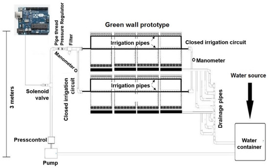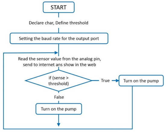 Similarly, a relay is a “switch” that is independently activated when it receives signals from Arduino when the soil moisture sensors or the rain sensor surpass the established threshold in its programming. This allows for an efficient use of water using sensors and actuators, only irrigating when the green wall substrate is dry or slightly moist [34], as we can see in the flow diagram of the Figure 8.
