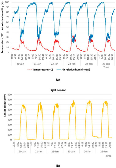 The Figure 9 shows the evolution of the readings taken during several consecutive days by the sensors of temperature and relative humidity of the air, humidity of the soil and precipitation. As can be seen, the outputs correspond to the expected responses of the sensors, that is, maximum values of humidity of the air in hours in which the temperature reaches its minimum, maximum readings of light at noon, as well as the fluctuations of the humidity of the substrate in response to the irrigation.