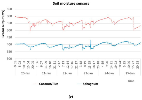 Sensor data of (a) temperature and relative humidity, (b) light, and (c) soil moisture.