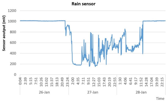 The Figure 10 show the data measured by the rain sensor during a rainfall recorded on January 26 to 28 in which 17.2 L/m2 were collected according to the weather station located in the vicinity (37°51′25″ N, 04°48′10″ W).
