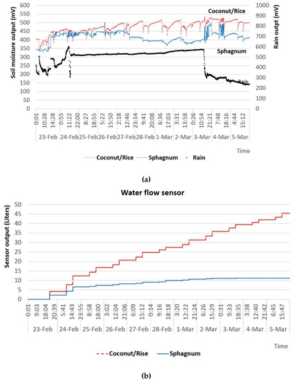 Sensor data of (a) soil moisture and rain and (b) water flow.