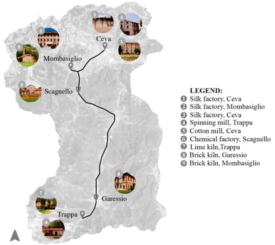 Since the 18th century, the area has been characterized by the presence of important industrial activities in the field of the production of cotton, wool, paper, glass, and other chemical processing. Most of the productive buildings were located along the Tanaro river for the availability of water and other natural resources useful for working activities. Moreover, at the end of the 19th century, the Ceva-Ormea railway was built thus ensuring the strategic connection of the area with the seaports and with the rest of the Piedmont Region [62].