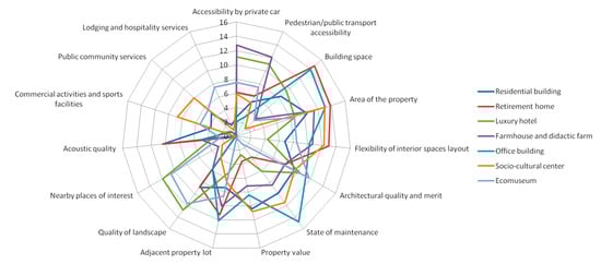 Step 4. Criteria weighting. To assess the criteria importance we implemented the method of cards proposed by Simos [67,68] and revised by [69]. According to the Simos method, the DM is given a set of cards with a criterion name on each and then he/she is asked to rank the cards/criteria in ascending order and introduce white cards if he/she deems the difference between criteria is larger, i.e., the larger the difference, the greater the number of white cards [70]. We then asked the DM to state the ratio z, that represents how many times the last criterion is more important than the first [69], which defines a fixed interval between the criteria weights. The weights were determined by implementing the SFR software [69] and by interviewing the panel of seven experts, i.e., one for each scenario. Each expert played the role of a DM who has to identify the most eligible building for being transformed according to the specific scenario. Table 1 displays the weights generated by SFR software, whereas Figure 3 provides a graphic representation of the 15 criteria and relative weights. As shown in Figure 3, it emerged that experts agree on assigning a higher weight (relative importance) to building typology and architectural features, and specifically available ground area and flexibility of interior spaces layout assume great importance due to their potential in adaptive reusability [71,72,73]. Accessibility plays a major role for the luxury hotel scenario and the farmhouse and didactic farm scenario; whereas the presence of nearby commercial activities and public community services does not play a major role in the transformation process. In addition, it is worth observing that the property value and the state of maintenance of the building are of minor relative importance in the retirement home and the eco-museum scenarios compared to the others. This is due to the fact the experts involved considered different criteria more relevant for the project feasibility, such as the appurtenance area in the retirement home scenario, and the quality of landscape in the eco-museum scenario. In addition, the panel of experts attributed greater (relative) importance (i.e., a higher weight) to the building state of maintenance when real estate assets are transformed into office buildings rather than in residential buildings. This is contingent on the specificity of the real estate market in the area under investigation, where retail and office buildings generate higher returns on investments than residential buildings, and to retrofit costs, which increase for office buildings, because of a niche demand for high quality improvements. This in turn reflects greater opportunities to arrange public–private partnerships, attract private sponsorships, and provide financial resources required to undertake investments [74].