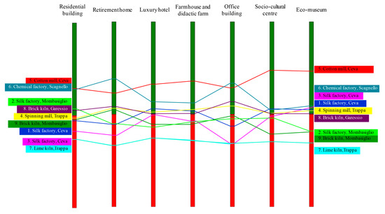 By implementing the PROMETHEE II method, a ranking of alternatives has been obtained for each decision scenario. Figure 4 shows the results of the PROMETHEE evaluation for the different intended uses considered in the study. According to the obtained results, alternative 5 (Cotton mill in Ceva) is the most suitable building to be reused for different purposes, including residential building, luxury hotel, farmhouse and didactic farm, socio-cultural center, and ecomuseum. This is due to the fact that the building is in a good state of conservation and it is very flexible to host new and differentiated functions. Alternative 6 (Chemical factory in Scagnello) embodies the best features to be reused as a retirement home or office building due to the possibility of a vast adjacent area that can be used for complementary functions. Conversely, building 7 (Lime kiln in Trappa) is ranked in the last position in all the considered decision scenarios. This is mostly due to the very rigid internal organization which makes the building unsuitable for reuse.