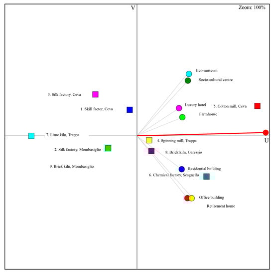 As shown in Figure 5, the experts focused their attention on criteria in two different ways. Representatives of the socio-cultural center and eco-museum are very close to each other, as well as the luxury hotel and farmhouse. They defend the same criteria evaluation as the axis are oriented approximately in the same direction and they prefer alternative 5 (Cotton mill in Ceva). On the other hand, the office building and retirement home representatives prefer alternative 6 (Chemical factory in Scagnello). In general, there is not a very strong divergence as all the preference axes are oriented to the right.