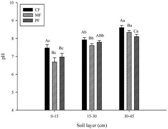 Almost all of the treatments did not significantly differ in EC; for example, the EC in the top-layer soil for CF, MF, and PF was 1206, 1288, and 1178 μS/cm, respectively, (Figure 2). Except for the MF, for the two other soils, the EC significantly decreased in the 30- to 45-cm soil (852.3 μS/cm).