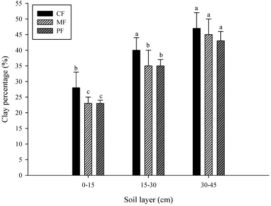The soil clay content significantly increased with the depth, but was not significantly decreased by the groundcover planting (Figure 3). From the surface to the 30-cm soil, the CF soils had a 5% higher clay content than both the MF and PF soil, whereas in the 30- to 45-cm soil, the MF and PF soil had a 2% and 4% higher clay content than the CF soil.