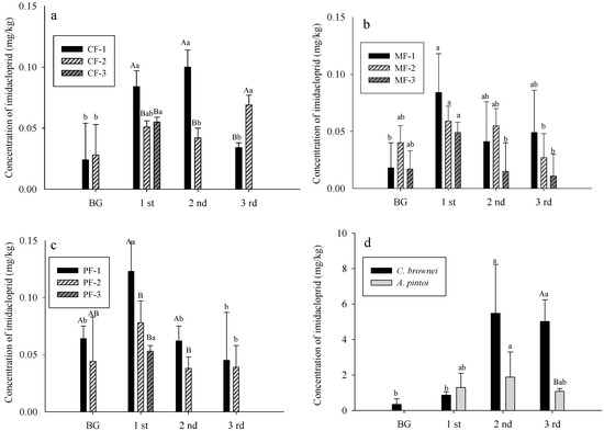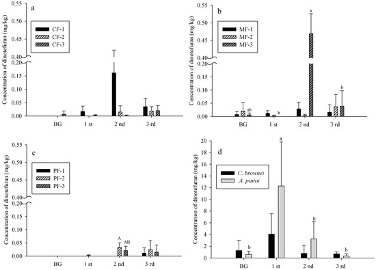 On 29 August, the dinotefuran level was 1.278 and 0.605 mg/kg in the MF and PF, respectively (Figure 5d, background), although the difference was not statistically significant. After one dinotefuran application on 4 September, the pesticide level after one day was 4.055 and 12.285 mg/kg in the MF and PF, respectively. After one month, the level dropped to 0.717 and 0.355 mg/kg, respectively. Thus, A. pintoi showed a greater absorption and metabolic ability for dinotefuran as compared with C. brownei.