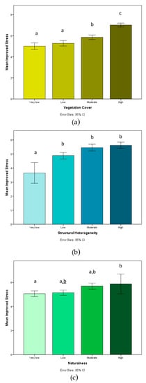 Mean improvement to self-reported stress at different levels of (a) vegetation cover, (b) structural heterogeneity, and (c) naturalness. Within each figure, labels above the bars denote significant differences between variables.