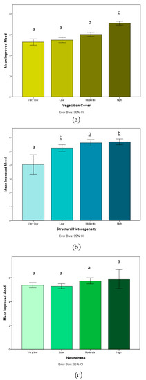 Mean improvement to self-reported mood at different levels of (a) vegetation cover, (b) structural heterogeneity, and (c) naturalness. Within each figure, labels above the bars denote significant differences between variables.