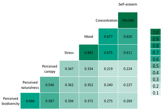 In order to examine the relationship between psychological wellbeing benefits (self-reported improvements to stress, mood, concentration, self-esteem) and perceptions of park attributes (perceived biodiversity, naturalness, and canopy cover) we first examined the Spearman correlations between each benefit, and each perceived attribute (Figure 5). Although all relationships were significant (p < 0.05) and stronger than those between wellbeing and assessed biodiversity attributes (Figure 1), correlations between wellbeing benefits and perceived biodiversity attributes were invariably weak. The four self-reported psychological wellbeing measures were highly correlated with one another. Perceived biodiversity was highly correlated with perceived naturalness. Of the perceived attributes, perceived biodiversity showed the strongest correlations with all four psychological outcomes.