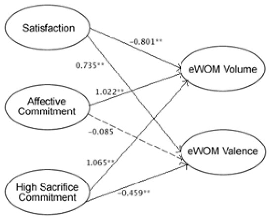 The results of the analysis show that our variables of study—customer satisfaction and commitment—have an important influence on both eWOM volume and eWOM valence. The affective commitment positively influences the eWOM volume (B = 1.022). This result can be easily explained: customers who like an online store and want to help it achieve its goals will strive to spread the word about that store to their Facebook friends. Thus they will not miss the opportunities to share information about the store, because this is a way to reward the company for their good experiences.