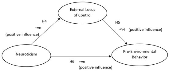 Neuroticism positively influences external locus of control [30,31], and positively influences pro-environmental behavior [43,52,59]. The second model assumes, therefore, external locus of control positively influences pro-environmental behavior.