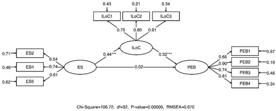 Diagram of structural equation modeling (SEM) results for internal local control (ILoC), emotional stability (ES), and pro-environmental behavior (PEB).