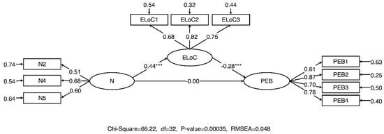 Diagram of SEM results for external local control (ELoC), neuroticism (N), and pro-environmental behavior (PEB).