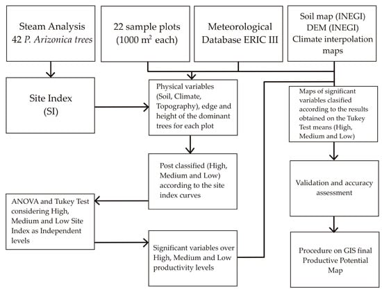 To create a spatial model of productivity we used physical variables of soil, topography and climate. The general methodological outline to elaborate such spatial model appears in Figure 2. The information was obtained from pure and mature stands of P. arizonica distributed over different aspects. We selected 42 P. arizonica dominant trees (tallest trees of the stands) from different conditions of slope, soil depth and aspect in the study area. Then, we carried out a stem analysis following the methodology proposed by the British Columbia Forest Productivity Council []. Each tree was harvested to subsequently perform cross-sectional cuts at 0.30 m, 1.30 m (diameter at breast height or DBH) and every 2 m until the stem reached 10 cm in diameter. The length of the remaining tip was recorded. Following guidelines, we counted the number of annual rings, measured diameters of the stem transverse cross sections, and estimated the height of the tree at different ages. This information integrated the database of height-age data pairs to perform the SI analysis.