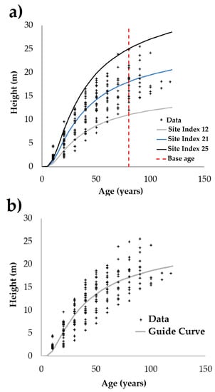 Graphical representation of the Site Index for P. arizonica Engelm fitted by using the Schumacher model (a) and the guide curve method (b).