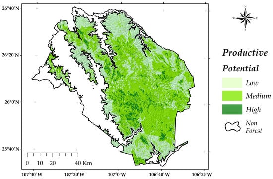 Pinus arizonica is a widely distributed tree species growing in temperate forests of Northwest Mexico where it is utilized through different regeneration harvest methods. Yet, management models based on estimations of its productive potential are sorely lacking. In this study, a procedure to create a productive map using site index (SI) equations and Geographic Information Systems (GIS) was developed. A SI model for P. arizonica was created for the study area and used to classify a group of randomly sampled plots on three productivity categories (High, Medium, and Low) for management purposes. Climatic, topographic and edaphic variables were determined on the sampled plots. Then, a statistically-based analysis was performed to identify the climatic, topographic and edaphic variables significantly influencing the productivity levels. Based on the values of these significant variables, a map of productive potential was elaborated for the whole study area. Sites with the highest productivity were those with slopes ≤12°, soil depths ≥0.46 m, minimum and maximum mean annual temperatures of 5 °C and 18 °C respectively, and precipitation ≥900 mm. This methodology could be considered for similar species/conditions where productivity models do not exist or to update old models rendered obsolete by climate change.