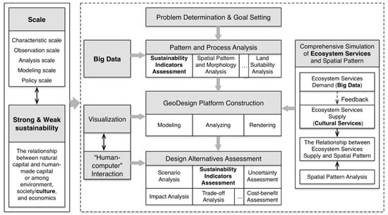 Among the six perspectives, the scale concept and strong/weak sustainability perspective run through the framework (Figure 2), depending on what problem designers face and what strategies designers take. The adoption of different scales or sustainability perspectives may lead to completely different results. The relationships between spatial pattern and ecosystem services can help choose optimal or preferred landscape patterns during design. The difficulty of applying ecosystem services in GeoDesign lies in the difference between the potential supply and realized supply of ecosystem services, the trades-offs and synergies among ecosystem services, and the linkages between ecosystem services and human wellbeing. Sustainability indicators, strongly related to strong/weak sustainability perspective and scale, can be used for assessment before, during, and after design. If the indicators are parameterized and presented by “human–computer” interaction, dynamic feedback can be realized in GeoDesign. Big data have been used in data management and demand analysis of ecosystem services. For example, it can capture open-access data, analyze word frequency, and then understand the public’s needs for ecosystem services. The application of big data needs novel algorithms. The volume, variety, and velocity of data may have great impacts on results. Considering culture in the relationships among environment, society, and economics will further influence every step of the framework. Before integrating culture and sense of place into design, clear definition, evaluation, and modeling are needed.