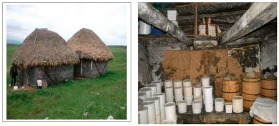 The production of sheep cheese is characterized by the simplicity of its manufacturing process. Immediately after dairying, sheep milk is flowed through a gauze, and then rennet is added, which curdles milk into cheese. In the next stage, milk is blended and left for coagulation to occur. After a sufficiently solid mass forms, it is placed in a specific linen for cheese squeezing. The process of squeezing is based on gravity, without any additional treatment. The method of cheese formation lasts until there is no remaining curd in the cheese bundle. This part of the process is vital given as the quality of the cheese depends on this stage. In addition, it is essential that the temperature of the room where the boiling and pressing are carried out is not below 20 °C. After the squeezing, the cheese is cross-cut into slices and salted with a kitchen salt, and then placed in 20–70 kg vats. The furled cheese is loaded with 5 to 10 kg stones. The typical dairy plant and production vats are presented in the Figure 3 [38]. The period of maturation, since cheese is formed from raw milk, must be at least 60 days [39]. This relatively simple tradition of production has been maintained to this day.