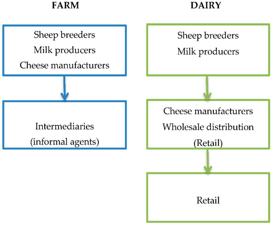 All stages of production (starting from the breeding of the sheep herds) of SSC are performed in the specific territory of the Sjenica-Pester plateau, in line with requirements for PDO registration [43]. In Figure 4, SSC supply chains are depicted according to the production subject–farm vs. dairy. Sheep breeders and milk producers are integrated and represent one actor in the SSC supply chain in both cases. At this level, the farm’s production also incorporates the production of cheese. After the cheese production, farms usually sell their cheese to intermediaries (informal agents). Dairies most often purchase milk from the farms and sell the cheese either through their own shops or to wholesalers, which further distribute cheese to the retailers.