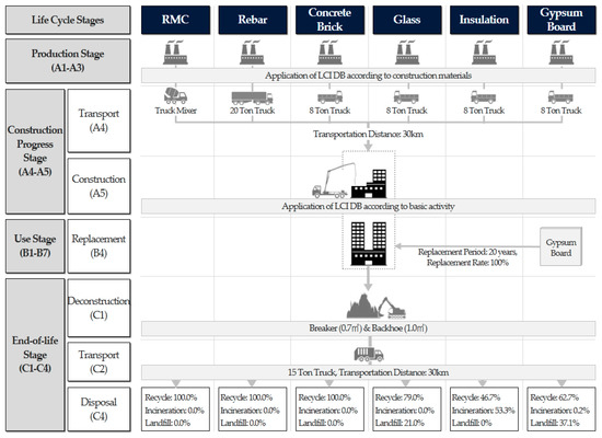 For the production stage, we applied the life cycle inventory (LCI) database of each major material. For the construction progress stage, the freight vehicle, and transport distance for each major material were based on the Standard Estimating System of Construction Work, by the Korea Institute of Civil Engineering and Building Technology [52]. For the use (maintenance/repair) stage, we set the lifespan at 40 years, drawing on the standards stipulated in the Enforcement Decree of the Corporate Income Tax Act [53], and applied the repair cycle and repair rate of each material according to the long-term repair planning standards stipulated in the Enforcement Decree of the Apartment Housing Act [54]. For the end-of-life (deconstruction/disposal) stage, demolition work involved breaker (0.7 m3), and backhoe (1.0 m3) operations [21], the quantity of waste construction materials was assumed to equal the sum of the input quantities of the six materials during the production stage. The freight vehicle and transport distance were set at 15-ton truck and 30 km, in keeping with the Standard Estimating System of Construction Work [55], and the rates of reuse, incineration, and landfill for waste construction materials were taken from the waste construction material disposal status released by the Korea Environmental Industry and Technology Institute.