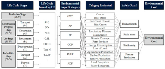 The environmental cost factor for the functional unit of each construction material was established using the life cycle scenarios for the major construction materials, LCI database, and KOLID methodology, a monetary valuation-based damage cost life cycle analysis methodology developed by the Ministry of Environment of South Korea [42]. The KOLID methodology was designed to promote the purchase of eco-friendly products by collectively evaluating not only the economic value of the purchase, use, and disposal of the product but also the value of environmental impact. This methodology quantifies 16 types of end-point damage, such as cancer, heat stress, infectious disease, skin cancer, and cataract, attributable to the six environmental impact categories (GWP, AP, EP, ODP, POCP, and ADP), and evaluates the four safeguards, consisting of human health, social assets, biodiversity, and primary production. The damage indicators of these four safeguards are the disability-adjusted life year (DALY), i.e., the number of years lost due to the following: ill-health, disability, or early death; economic burdens of suppression or depletion of agricultural crops, marine, forest, or mineral resources, and fossil fuels; the expected increase in the number of extinct species (EINES) of vascular and aquatic plants; and the net primary production (NPP), i.e., the amount (kg/m2·yr) of organic matter resulting from photosynthesis by terrestrial plants and marine plankton, respectively. The environmental cost is represented by the marginal willingness to pay (MWTP) for these damage indicators using the MWTP unit that established the database in the KOLID methodology. MWTP is a contingent valuation method reflecting the threshold price consumers are willing to pay in a virtual market of a given material type.