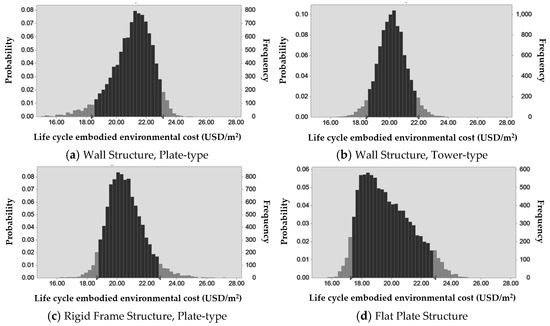 Figure 4 illustrates the estimated environmental costs, presented as probability distributions. The environmental costs of each apartment building, concentrated on one single mode, show normal distributions, except the flat plate structure, which shows a left-skewed triangular distribution. This implies that the PDFs for wall structure and rigid frame structure have small deviations from their respective modes and relatively regular distributions, whereas those for the flat plate structure resulted in a skewed distribution, presumably due to its smaller sample size and larger deviation.