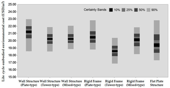 Table 6 presents descriptive statistics for the estimated life cycle embodied environmental costs. The environmental cost range for apartment buildings was estimated as 10.18–34.06 USD/m2, with the variability amounting to ~72%. In particular, both the minimum and maximum environmental costs related to buildings with plate-type wall structure. This finding was attributed to the larger sample group than the other structure types and plan forms, allowing a more comprehensive evaluation range. Therefore, assuming that the upper and lower 5% of the cost range, randomly estimated through MCS, represent unrealistic values for all input quantities of major construction materials, we re-analyzed the costs using the remaining 90%. Consequently, the minimum (16.87 USD/m2) and maximum (23.03 USD/m2) costs were associated with rigid frame structure tower-type and wall structure plate-type apartment buildings, respectively. Moreover, they showed a variation ratio ranging from 14.29% to 23.84% depending on the structure type and plan form; excluding buildings with flat plate structure, which exhibited a variation ratio of 23.84% due to the small sample size, the variation ratio was found to be less than 20% in all apartment buildings.