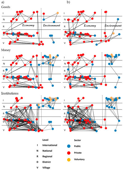 Figure 2 provides an overview of the three networks (flows of goods, flows of money, shared institutions) among these actors, for both study villages. Nodes represent the actors involved in the land governance network, with color codes distinguishing actors from three different sectors (public, private, or voluntary sectors). Further, the nodes are positioned in each network graph in Figure 2 according to the level of action they belong to, from the village level (bottom of each graph) to the international level (top); and from the economic domain (left) to the environmental domain (right). The network ties between the nodes represent the flows of goods (top two graphs of Figure 2), money (middle graphs), and shared institutions that the actors adhere to (bottom graphs). For the networks of goods and money flows, the ties convey an exchange of goods or money between the actors, once or more, as assessed in the survey and in the secondary data. In the institutional networks, two actors are linked by a tie if they share at least one institution.
