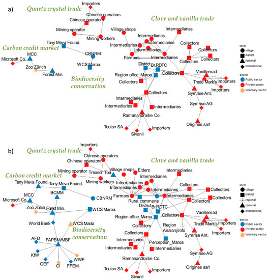 Network graphs representing interactions in terms of goods, money, information and institutions among the actors involved in land governance in the two case study areas of (a) Morafeno; and (b) Mahalevona. Variance in vertical positions of the nodes indicates the level to which the actors belong: international, national, regional, district, or village. The left/right of the dashed line represents the actors’ domain: either economic, i.e., trade of cash crops and trade of quartz crystal (for Morafeno village only); or environmental, i.e., biodiversity conservation, silk network (for Mahalevona village only), and the carbon market (for Morafeno village only).