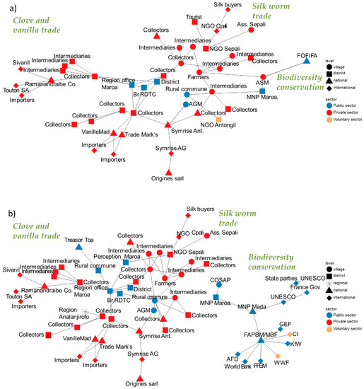 Besides lack of coordination, actors belonging to different sectors are dominant in the two different domains, which can reinforce land competition. Some observers [27] highlight the dominance of the private sector (traders/companies) over the public sector (state) in current land governance. The private sector could provide more support to the public sector in its tasks and roles, reinforcing the central position of the latter in the land-governance system. In Indonesia, the private sector contributes significantly to REDD+ governance through private markets and finances [31]. However, other observers [76] claim that competition can result between governments, NGOs, and corporations. With this in mind, we found that regulation of the commodities trade and conservation activities in Madagascar officially remain the responsibility of the public sector, i.e., the local and national Malagasy government. This regulating role is smaller than in times past [30], as the vanilla market was a state-run monopoly prior to 1993 [77]. Today, states appear to be reasserting their regulatory power, such as in the case of forest and agricultural certification in Indonesia [78] or “land grabbing” governance [79] globally. Collaboration between public and private sectors can be effective under sustainable institutional contexts [76,80]. To achieve sustainability in our study context, more in-depth research on key actors appears necessary [59,81].