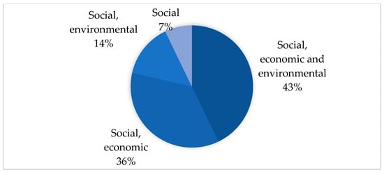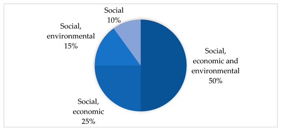 Regarding the dimensions of sustainability addressed in the papers of our sample, results show that 32 out of 61 papers (52%) consider the social, economic and environmental dimensions of sustainability to some extent. Furthermore, 10 papers (16%) address the social and economic dimensions of sustainability and 6 papers (9.83%) address the social and environmental dimensions only. Lastly, 6 papers (9.83%) consider the social dimension only, 5 papers (8%) consider the economic dimension alone and 2 papers (3%) only consider the environmental dimension (see Figure 3).