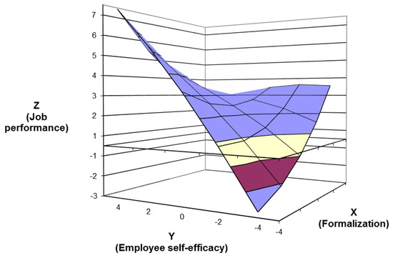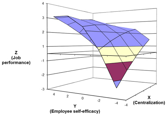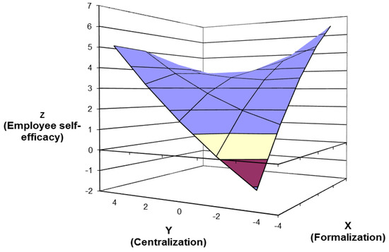 To establish firm associations between our variables of interest and to test for the other hypotheses (H4, H5, and H6), we also conducted post-hoc analysis based on polynomial regression and response surface analysis [129]. The benefit of this analytic approach allows for a three-dimensional view of the relationship between combinations of two predictor variables (e.g., centralization and formalization) and an outcome variable (e.g., self-efficacy). The results are presented in Table 5 and Table 6. The interaction of formalization and centralization on employee self-efficacy was found to be significant and negative (β = −0.50, p < 0.001). Hence, H4, which states that formalization and centralization will have a joint interactive effect on self-efficacy is supported. H5, which states that the relationship between employee self-efficacy and job performance will be weaker when formalization is high, is supported (β = −0.37, p < 0.01) (Table 6, model 2). Similarly, H6, which states that the relationship between employee self-efficacy and job performance will be weaker under conditions of high centralization was also supported (β = −0.26, p < 0.01) (Table 5, model 3).