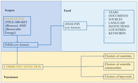 Once the results of the Scopus search related to biomass as a renewable energy were obtained, this study carried out an analysis of the types of documents, language of the documents, scientific production and its trend, main scientific institutions with scientific productions related to the subject, collaborations between countries and main authors in the subject, and the evolution in the use of key words. Another key aspect of this research was the identification of scientific communities using Vosviewer software (http://www.vosviewer.com/). Vosviewer is free software that allows you to build and visualize bibliometric networks from data obtained from bibliometric searches of important databases such as Scopus [36]. Figure 1 shows a scheme of the methodology used.