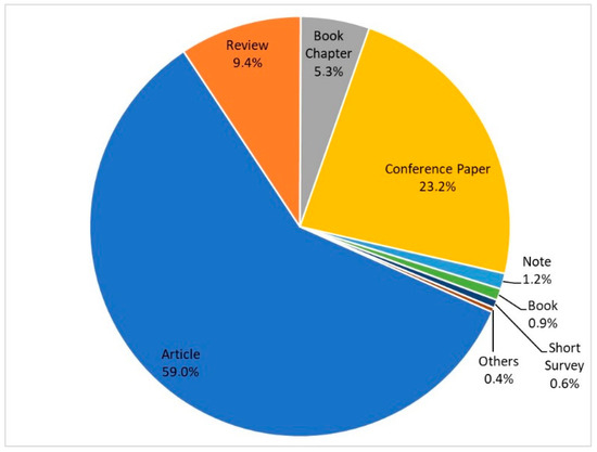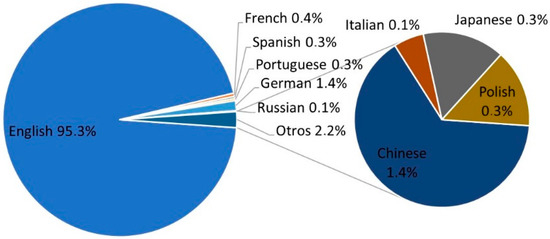 In reference to the type of languages used in the publications obtained from the search, most of the documents were published in English in international journals, followed by Chinese (2.04%), German (0.30%) and Spanish (0.27%). Figure 3 shows the percentage of the different languages in which the different documents obtained from the bibliometric analysis have been published.