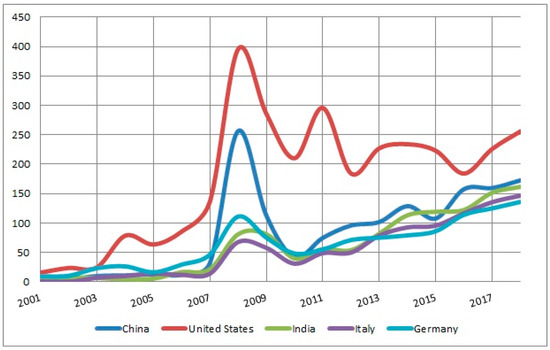 Figure 6 represents the evolution of the number of documents from the 5 countries with the highest scientific production related to biomass as renewable energy. It is possible to observe how in 2008 these 5 industrialized countries regain their scientific production on this subject due to the sustainability policies carried out by the different governments.