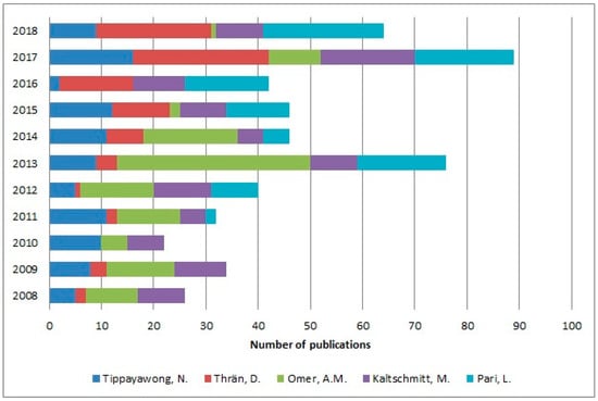 This study also carried out an analysis of the most prominent authors in the fields of renewable energy production with biomass. Figure 9 and Table 6 show the scientific production of the 4 main authors on this subject in the last ten years. Omer, A.M. stands out in this field with 122 publications since 2008. This researcher has an h-index of 15, followed by Pari, L. with an h-index of 14, Kaltschmitt, M. with an h-index of 17 and Tippayawong, N. with an h-index of 15.