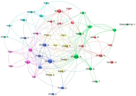 Figure 10 shows the detection of scientific communities of authors using the VOSviewer software. This figure shows the relationships between the main researchers in the field of biomass as renewable energy. Asian researchers with strong research connections between them stand out due to both the language and the proximity of their institutes. Cluster 1 (red) is the biggest in terms of number of members with ten authors, followed by cluster 2 (green) with eight authors. The top high-yield authors formed their own cooperative team. The largest node is Zhang, X., who has 20 publications and 8 neighbors, followed by Wang, Y., who has 19 publications and 7 members.