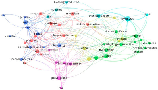 Biofuels are used in all three states of matter, i.e., solid, liquid and gaseous. In solid state are basically wood and chips, charcoal and pellets [42]. In liquid form, bioethanol and biodiesel stand out. In addition, in the gaseous state, there is biogas (methane, hydrogen and nitrogen, above all), normally obtained either by anaerobic fermentation of microbiological origin, or by gasification (partial oxidation of biomass at high temperature, about 1400 °C, without combustion) [43]. Table 8 shows the principal characteristics of each cluster detected in Figure 13. As can be seen, 6 communities or clusters were found. The two most important are focused on obtaining liquid fuels from biomass. The red cluster is mainly focused on the production of biodiesel, both in the classic ways of obtaining by transesterification of oils from seeds (especially rapeseed and sunflower) or from vegetable oil residue of industrial processes. This includes new sources of fat or raw materials such as microalgae [44,45] or insects [46], and was found as a keyword for the country of Brazil [47,48]. The second cluster, the green one, is more focused on bioethanol, produced either from sugars from crops such as sugar cane [49] or beet [50], or from starches from crops such as potatoes, corn or other cereals. The other line of work in this cluster is the production of hydrogen or other hydrocarbons from biomass gasification [23]. The third cluster is devoted to two fundamental issues, the generation of electricity from biomass and the production of biogas, the latter produced from livestock waste (slurry) [51], sewage sludge [52], urban solid waste [53], agricultural waste [54] and industrial organic waste [55]. Given the diversity of origins in the production of biogas it is logical to find key words from countries as different in customs such as: Germany, Pakistan and Spain. The fourth yellow cluster focuses on China and the assessment of its resources for sustainable development [56]. Finally, we find clusters 5 and 6, which are the smaller ones. The purple cluster 5 focuses on the Power Plant and the alternative to the Coal, as it has topics related to environmental impact [57]. Cluster 6, turquoise in color, revolves around pyrolysis and India as a leading country [58].